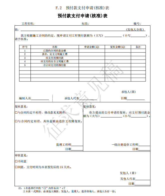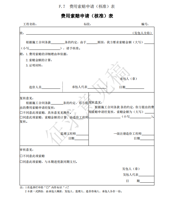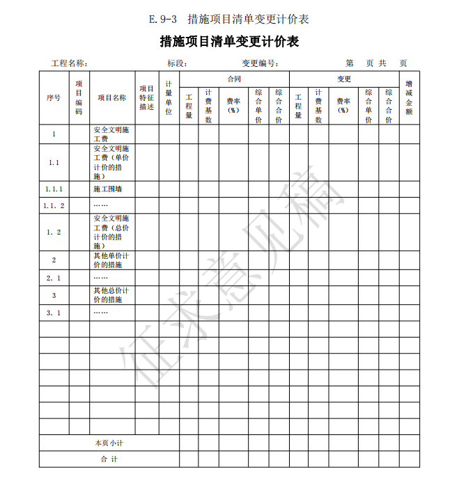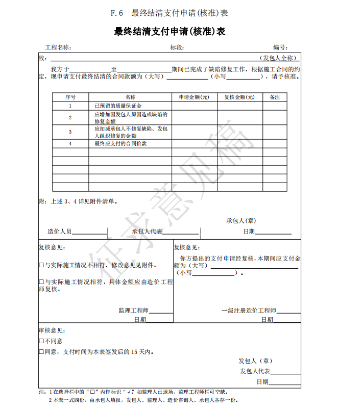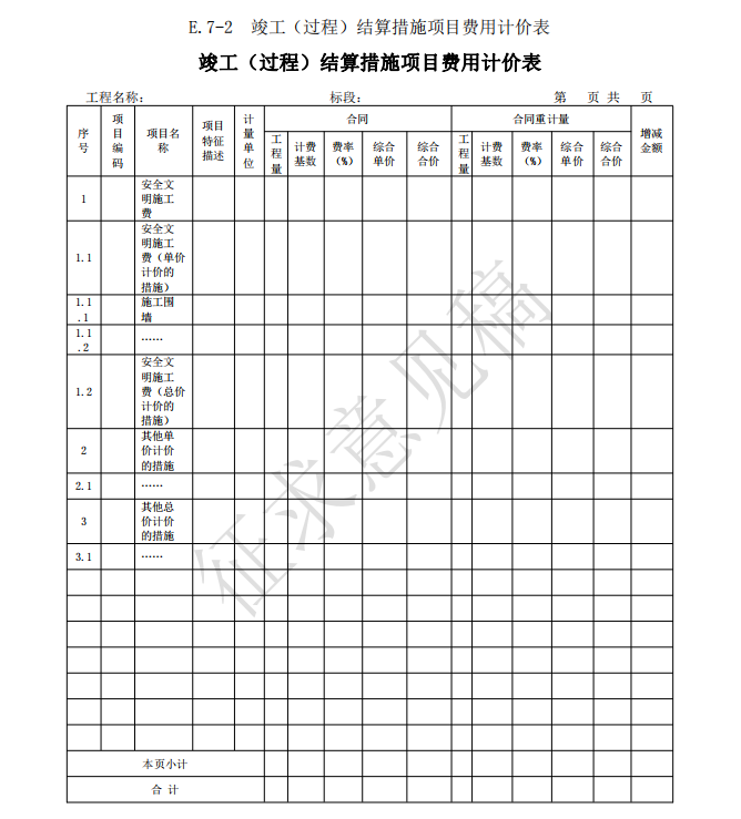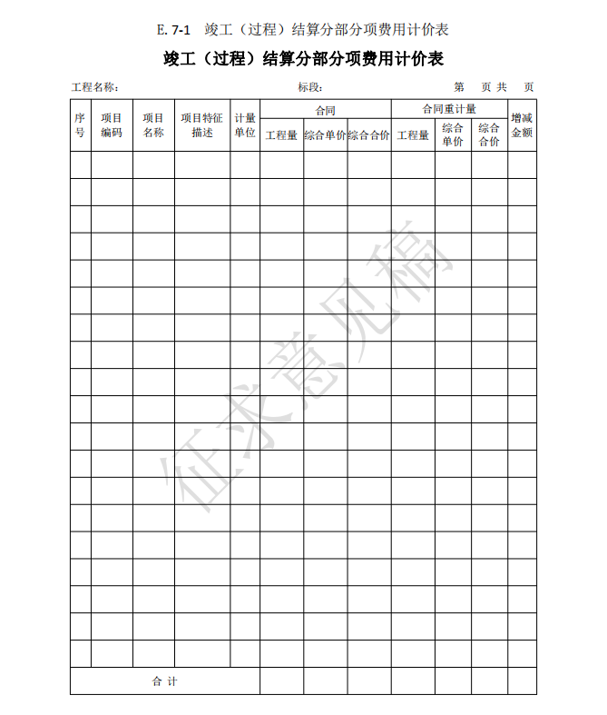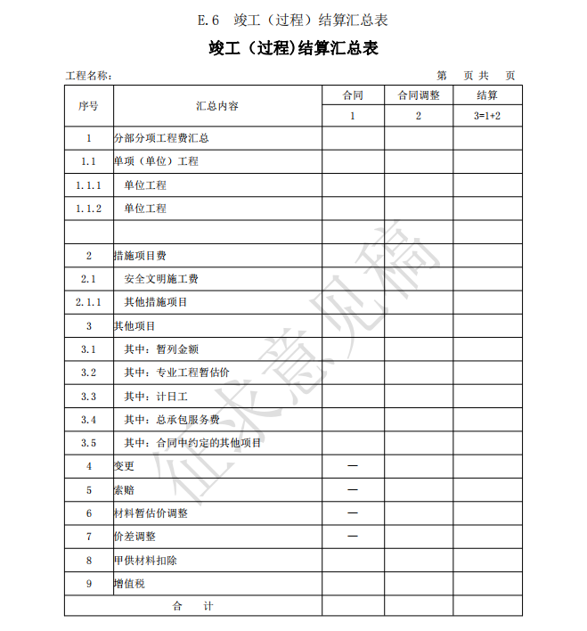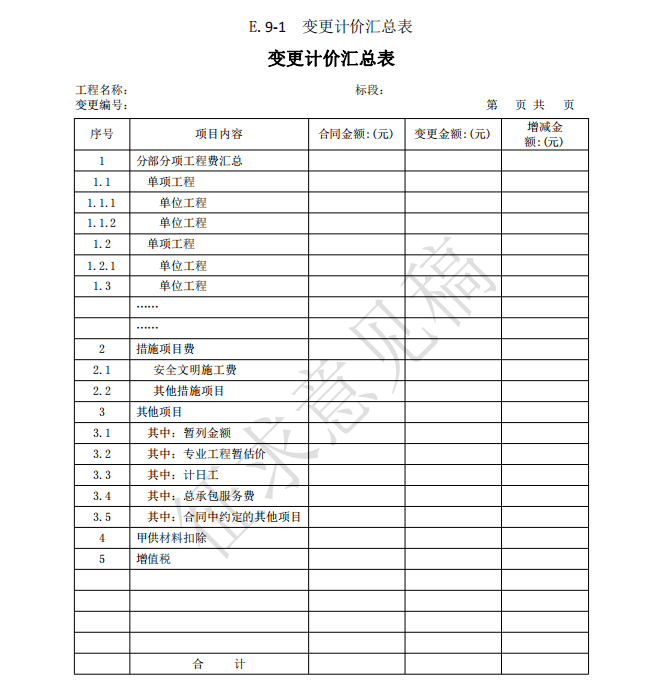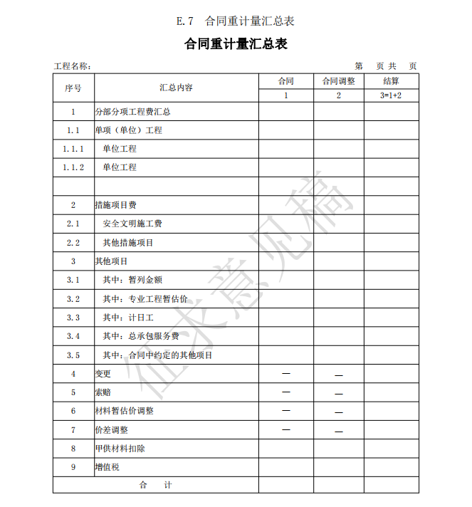 3)竣工(過(guò)程)結(jié)算使用的表格包括:B.4、C.4、D.3、E.6、E.7、E.7-1、E.7-2、E.7-3、 E.8、E.9-1、E.9-2、E.9-3、E.9-4、E.10、E.11、F.1、F.2、F.3、F.4、F.5、F.6、F.7、G.1、 G.2、G.3、G.4。