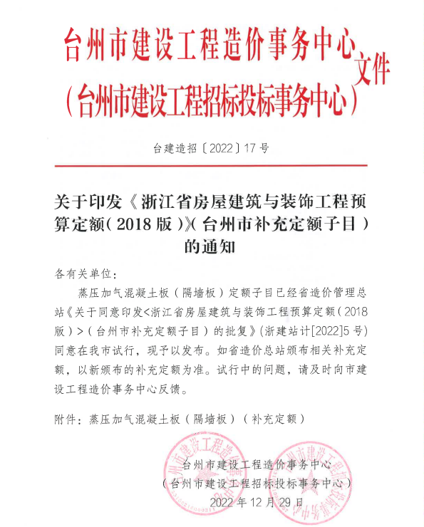 【轉(zhuǎn)發(fā)】關(guān)于印發(fā)《浙江省房屋建筑與裝飾工程預(yù)算定額(2018版)臺(tái)州市補(bǔ)充定額子目》的通知