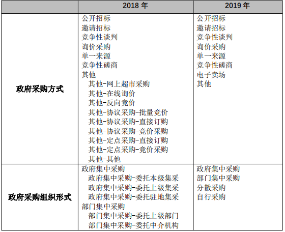 按照政府采購(gòu)法及其實(shí)施條例的規(guī)定,并結(jié)合浙江省政府采購(gòu)信息化建設(shè)的成果,簡(jiǎn)化金財(cái)工程政府采購(gòu)管理系統(tǒng)(內(nèi)網(wǎng))政府采購(gòu)計(jì)劃的編制。將政府采購(gòu) 組織形式從2018年的10類簡(jiǎn)化為政府集中采購(gòu)、部門集中采購(gòu)、分散采購(gòu)和自行 采購(gòu)4類;政府采購(gòu)方式從2018年的15種簡(jiǎn)化為公開招標(biāo)、邀請(qǐng)招標(biāo)、競(jìng)爭(zhēng)性談判、 詢價(jià)、單一來(lái)源采購(gòu)、競(jìng)爭(zhēng)性磋商、電子賣場(chǎng)和其他8種(詳見(jiàn)表1)。