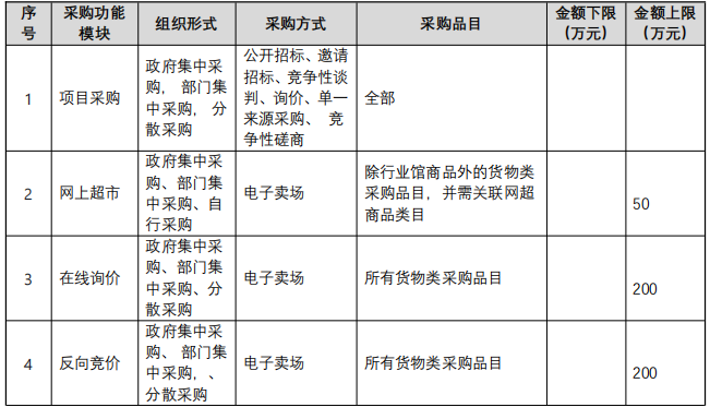 如一個(gè)采購(gòu)計(jì)劃匹配多個(gè)采購(gòu)功能模塊的,采購(gòu)人可自行選擇在其中一個(gè)模塊實(shí)施采購(gòu)。